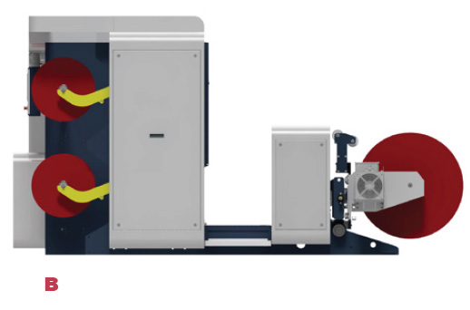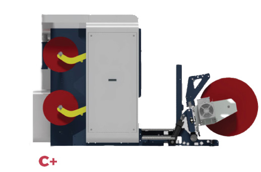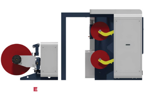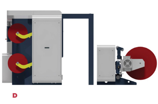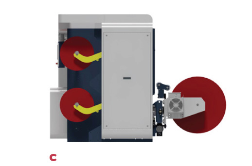 - Unwind roll on semi-integrated shaftless unwind stand placed on the rear of the machine with lifting from floor level to working position